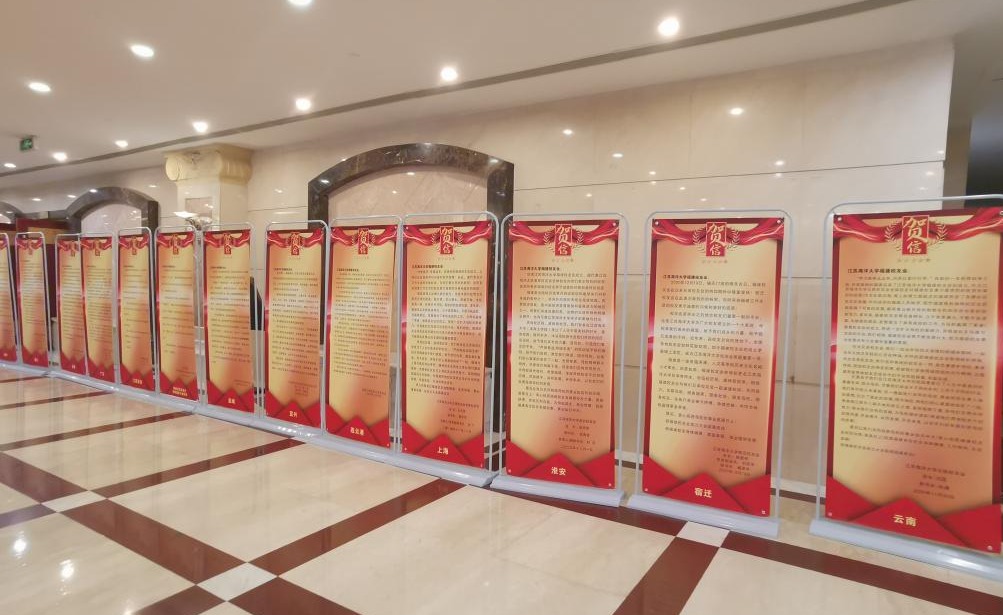 福建校友会是学校更名以来成立的第一个省级校友会,全国各地校友会纷纷发来了热情洋溢的贺信。精心制作的大幅贺信,摆满了进入会场走道的两侧,色彩绚丽,引人注目,为大会增添了许多喜庆气氛。