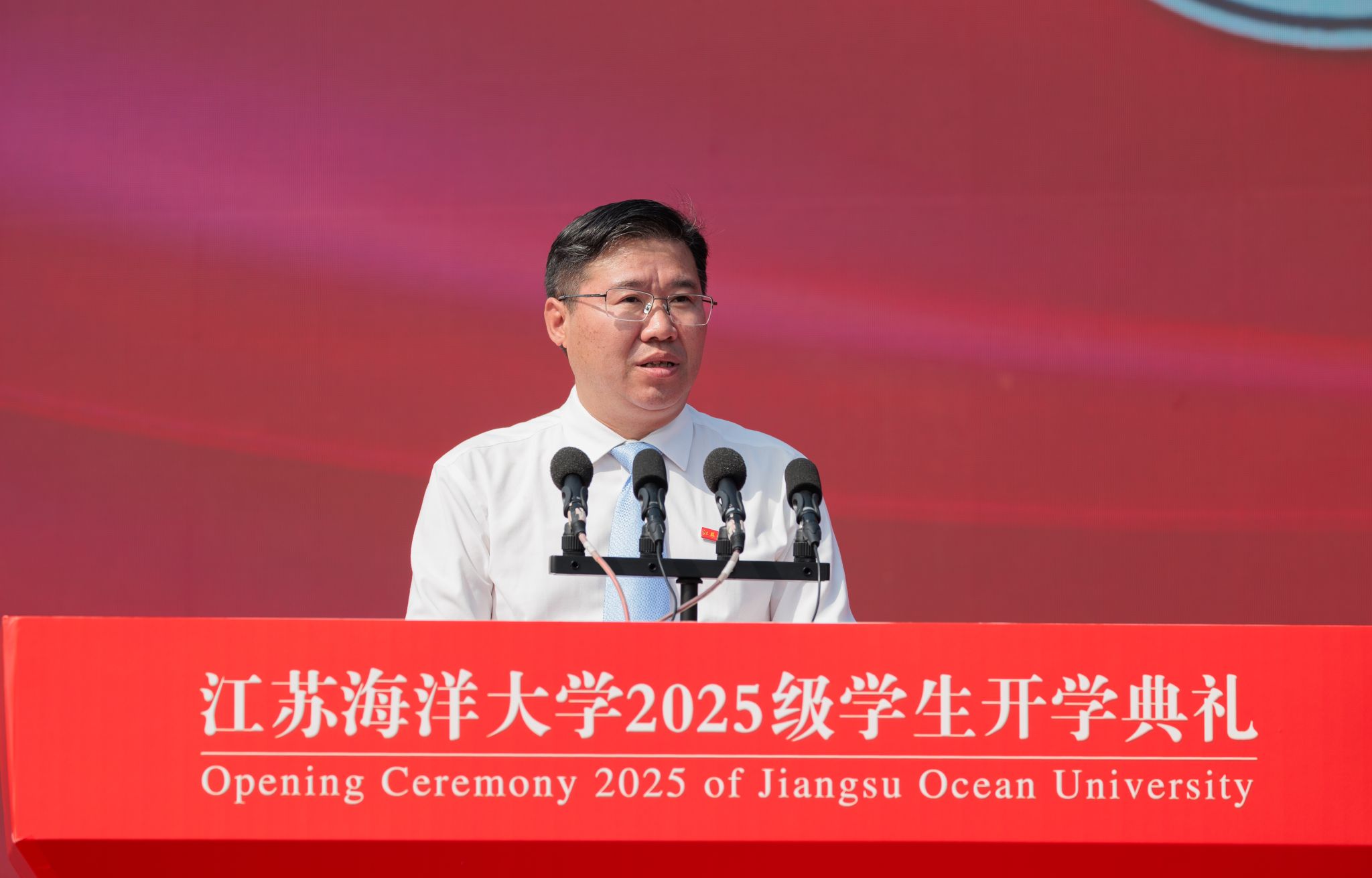 在庄重而热烈的气氛中,一项具有象征意义的仪式举行。校党委书记许峰为新生代表佩戴上江苏海洋大学校徽。所有新生同时将熠熠生辉的校徽郑重地别于胸前,不仅标志着他们正式成为“江海大”人,更象征着一份厚重的使命与精神的传承。他们成为海大奔涌向前的新鲜力量,他们将个人成长融入时代发展的壮阔洪流之中,坚定理想信念,锤炼过硬本领,以青春之奋斗诠释向海图强、强国有我的使命担当,在实现民族复兴的宏伟征程中绽放独特光彩。