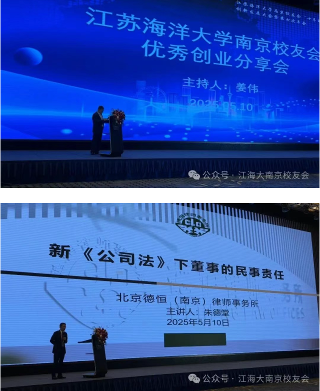 创新发展大会由校友会副会长姜伟主持,介绍在场嘉宾后,首先江苏海洋大学南京校友会顾问朱德堂以自身所在德恒律师事务所的工作经验和专业积累为基础,分享“新公司法下董事的民事责任”。生动形象地解释了董事与股东之间的运行机理,提供了公司良性循环的解题思路,现场掌声雷动。