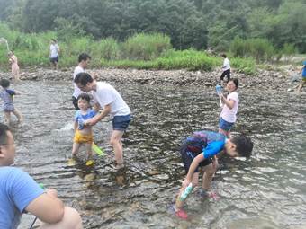 稍事休息后,大家便驱车前往山上的漂流点,由于月亮湾漂流游客太多,领队及时调整了行程,先去玩水,第二天上午再进行漂流。在清澈的河水里,小朋友玩得很开心。