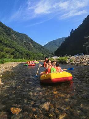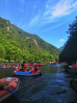 8月25日的清晨六点多,校友们在天然氧吧中醒来,吃完早饭后自驾上山,山路畅通无阻,景色优美,空气清新,大家很快就到达月亮湾橡皮筏漂流点。箭步冲向河中,坐上皮筏。顺流而下,整条水路,有的地方平缓,有的地方稍带落差。孩子们在平缓的水域开心得打水仗,浑身上下都湿了,家长们也无一幸免。
